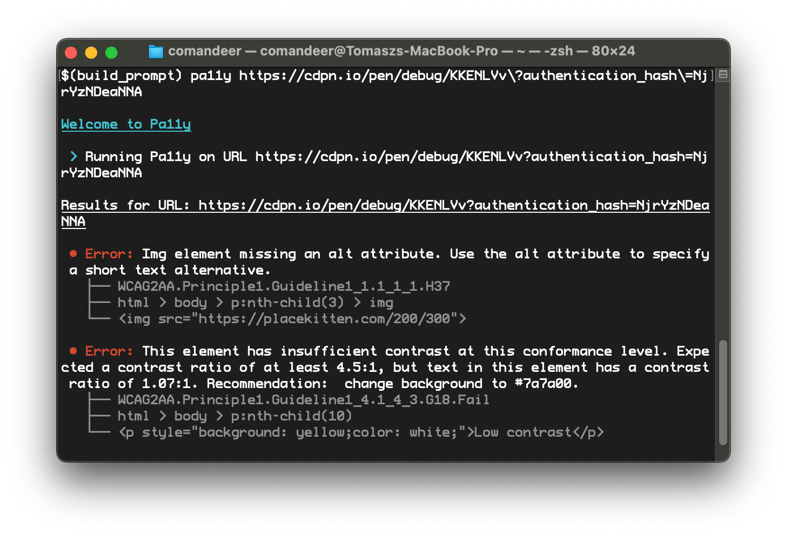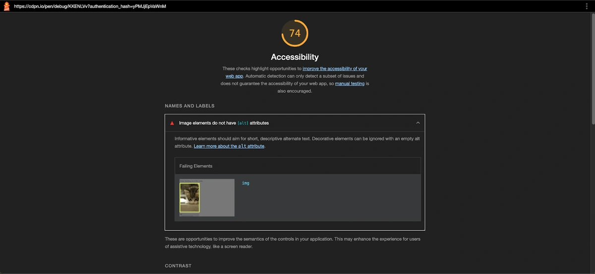So both report very similar issues. But there is one bonus: a summary of the current state of the page’s accessibility in the form of a score from 0 to 100. Reports also contain screenshots of noncompliant elements for some of the found issues. And that’s basically it.