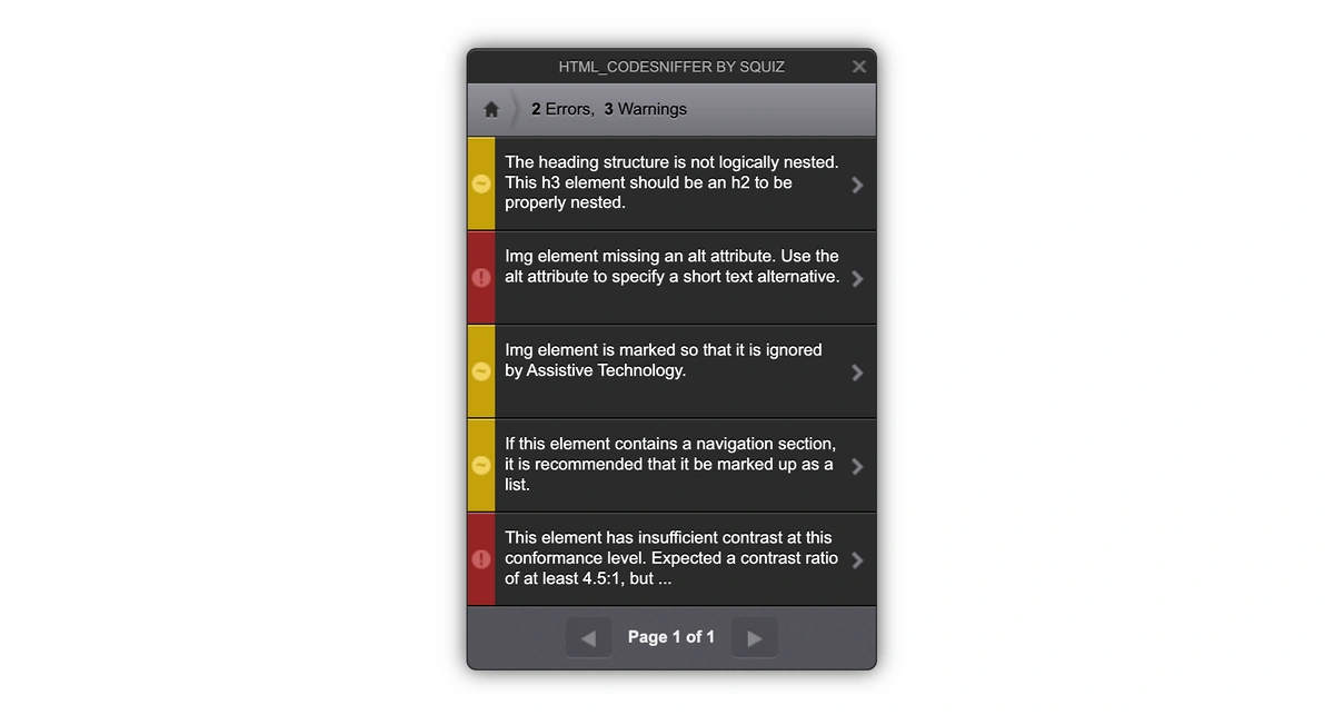 - HTML_CodeSniffer also worked pretty well, detecting five out of eight existing accessibility issues. However, it identified one of them incorrectly: instead of indicating there are two adjacent links to the same location, HTML_CodeSniffer considered it an incorrectly marked-up navigational region, recommending changing the two links to a list when it should have suggested merging the two links together