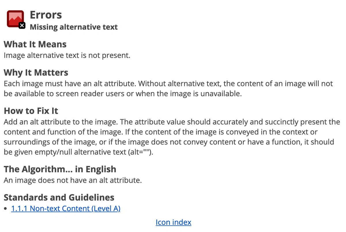 The biggest pro is the detailed description of each issue. The WAVE web app and extension arguably have the best documentation out of all of the tools on this list – and they’re also easy to use.