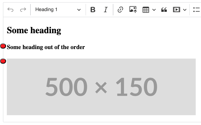 The results appear next to the editor’s content, showing red dots near elements that failed checks.