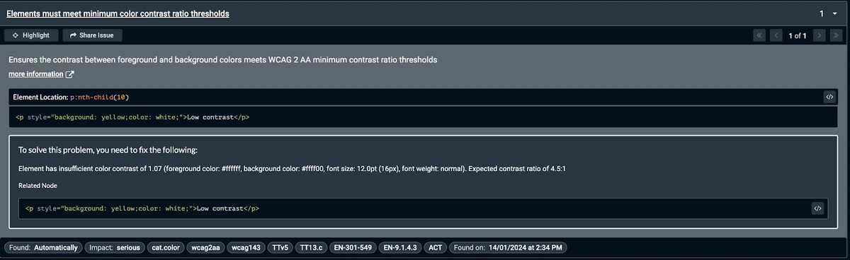 | Low contrast paragraph | Detected with a link to a page with more details | Detected with a link to a page with more details | Detected with a hint (“Recommendation: change background to #7a7a00.”) | Detected with a link to the standard | Detected with a detailed description | Detected with a link to the standard and proposal of how to fix |