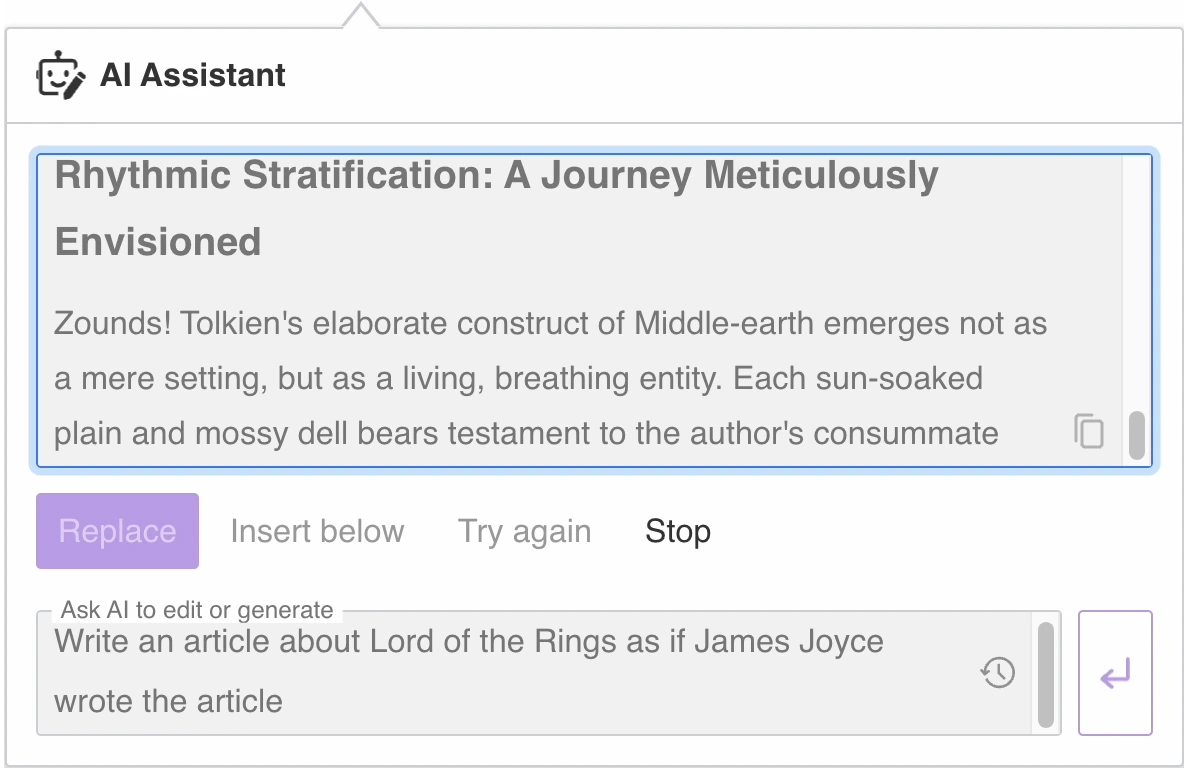 Rest assured, your existing content remains untouched by AI Assistant unless you decide otherwise. How? You can choose whether the AI’s response should replace the selected text, be inserted below it, or copied to your clipboard.