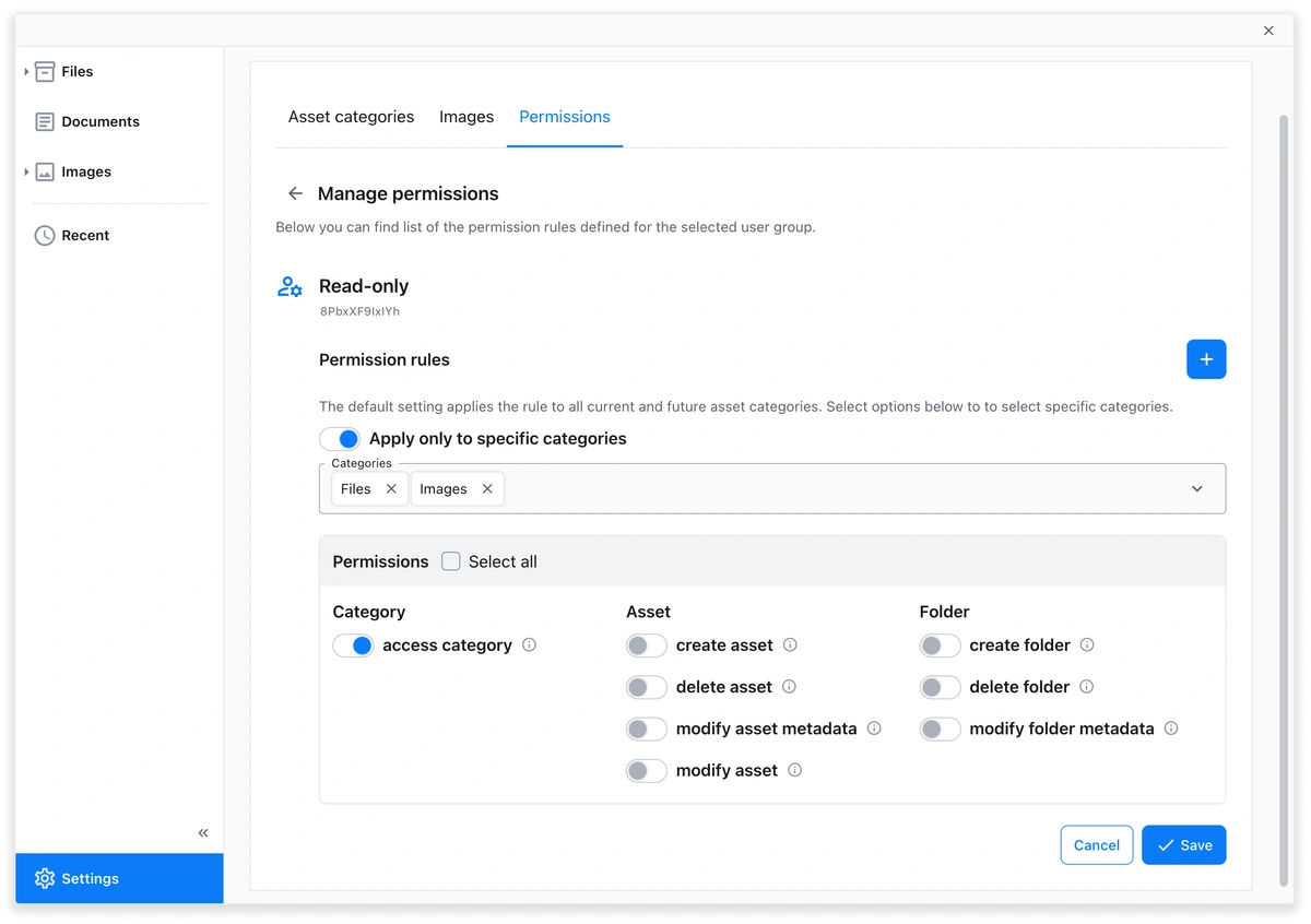 - Granular Control: Each action can be controlled independently, enabling detailed management of user access and actions. Permissions can be set to control actions such as accessing, creating, deleting, or modifying an asset or its metadata, as well as creating or deleting folders and modifying their metadata.