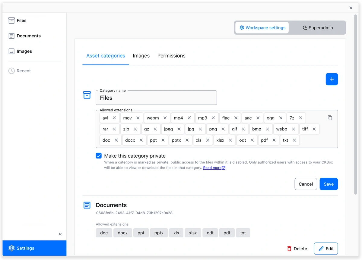 With Private Categories, administrators can now set specific asset categories as private, limiting access to authorized users only. By default, all files uploaded to CKBox are public, meaning that anyone with a link—such as a CDN link—can access and download those files. The Private Categories feature addresses this by allowing administrators to block public access to these links, making assets accessible only to selected, authorized users.