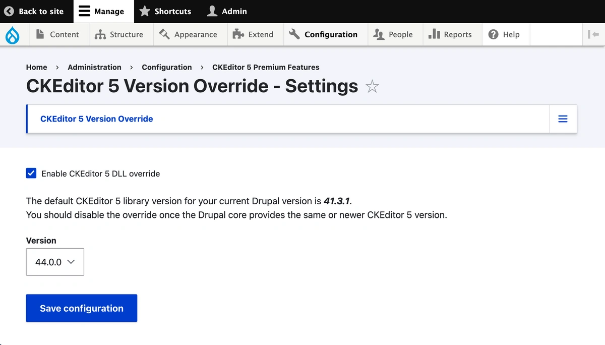 The CKEditor 5 Version Override Submodule allows you to manually upgrade the CKEditor 5 version in your Drupal project to access the latest editor capabilities. To enable this submodule, install or upgrade the Premium Features Module to version 1.3.4. Once activated, you can upgrade CKEditor 5 to version 44.0.0, unlocking the new Self-Service Licensing feature. For more details, consult the Premium Features Module Configuration Guide.