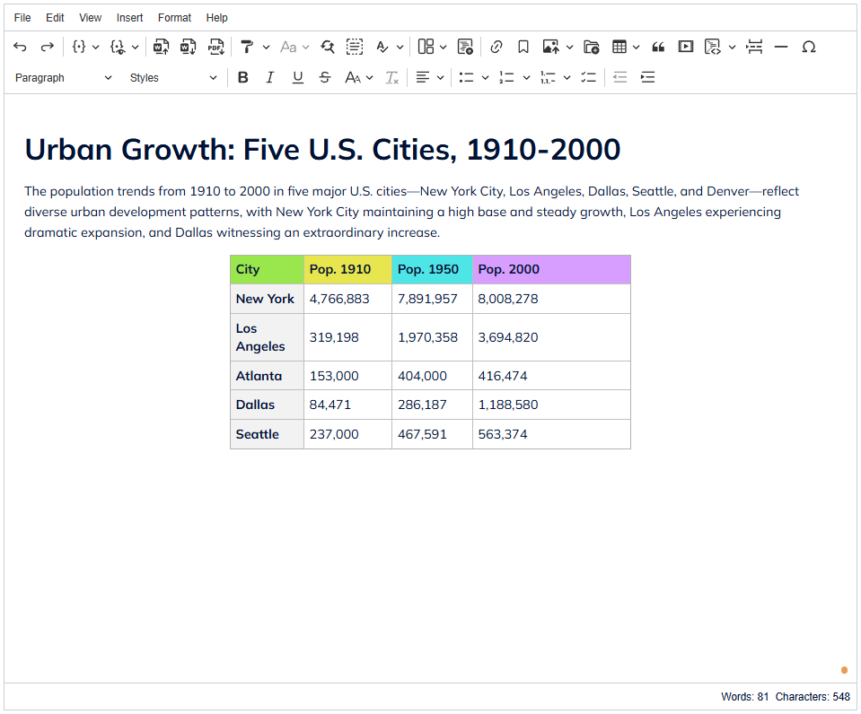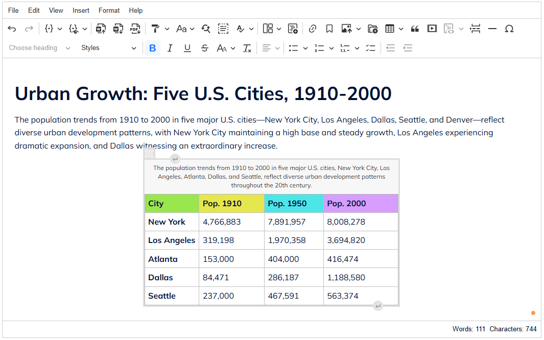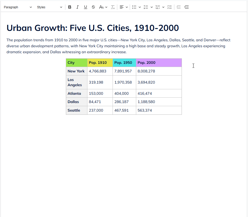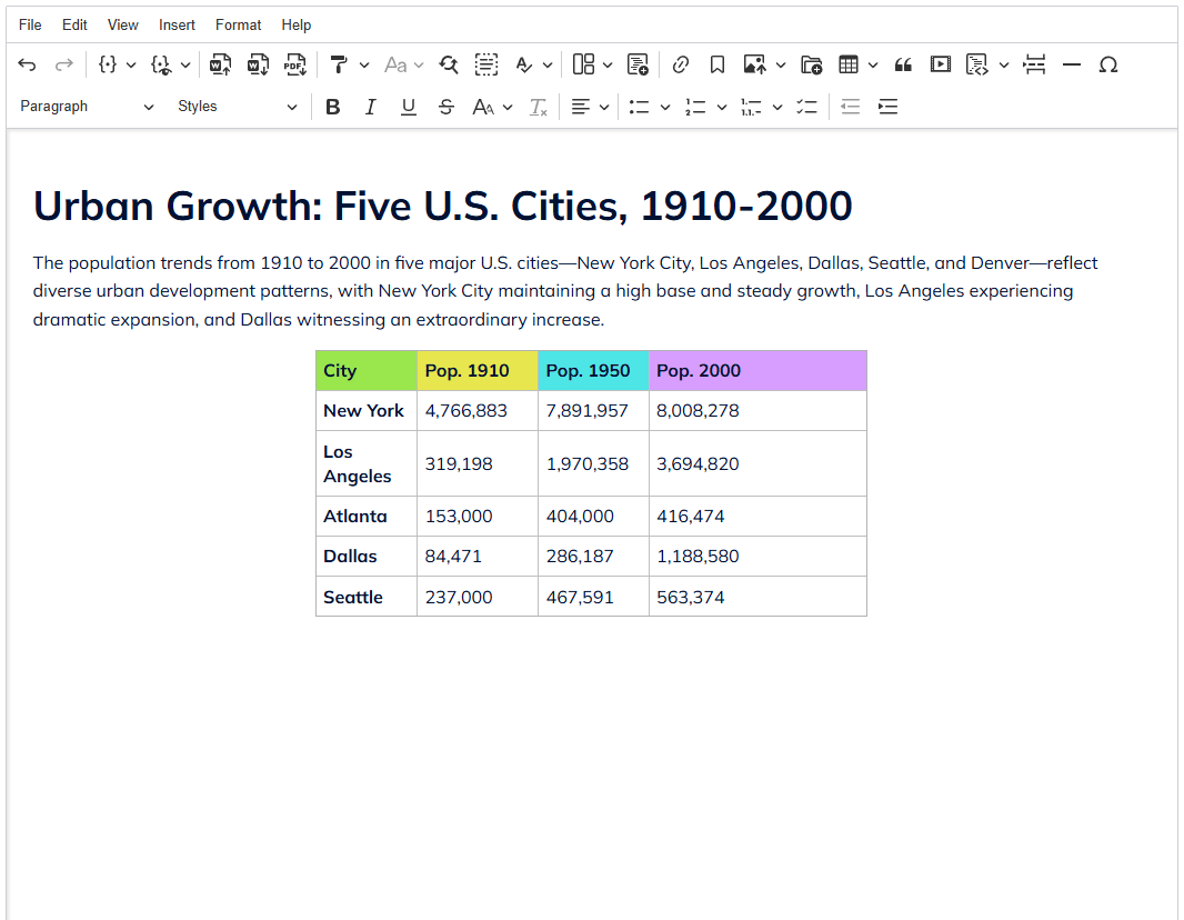 For a hands-on demonstration of these capabilities, visit the CKEditor 5 Table and Cell Styling Demo which provides an interactive walkthrough of these features. This comprehensive demo illustrates how users can create complex data structures, and manage large datasets efficiently. Visitors can experiment with features like cell merging, background color adjustment, and header row configuration, all while experiencing the responsive and user-friendly interface firsthand.