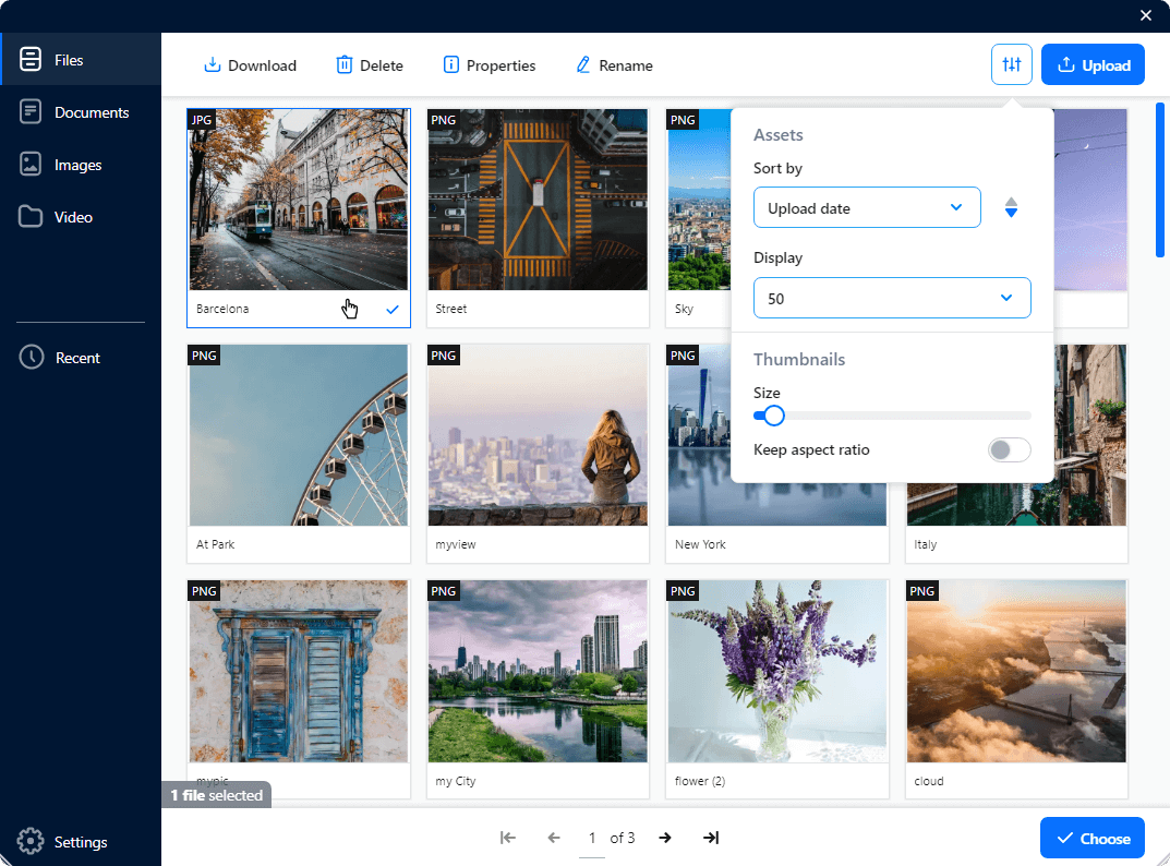 Supported file types range from responsive images to videos and documents, with compatibility for efficient formats like WebP that improve loading times and SEO performance. CKBox’s interface is designed for flexibility, allowing users to adjust thumbnail sizes, display settings, and navigation preferences. This level of customization ensures that users can align CKBox with their unique workflows.