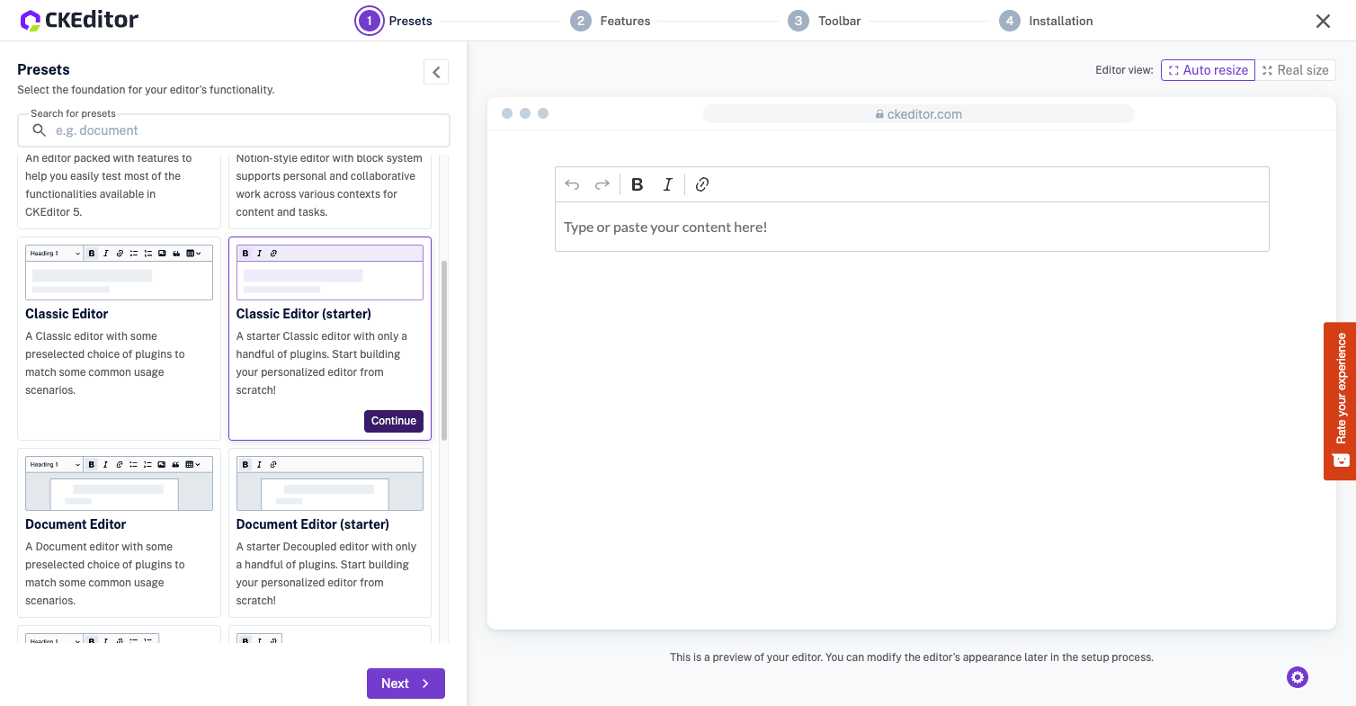 Choose from the available presets. For this guide, we’ll use the Classic Editor (starter) for a simple setup. Click Next to continue.