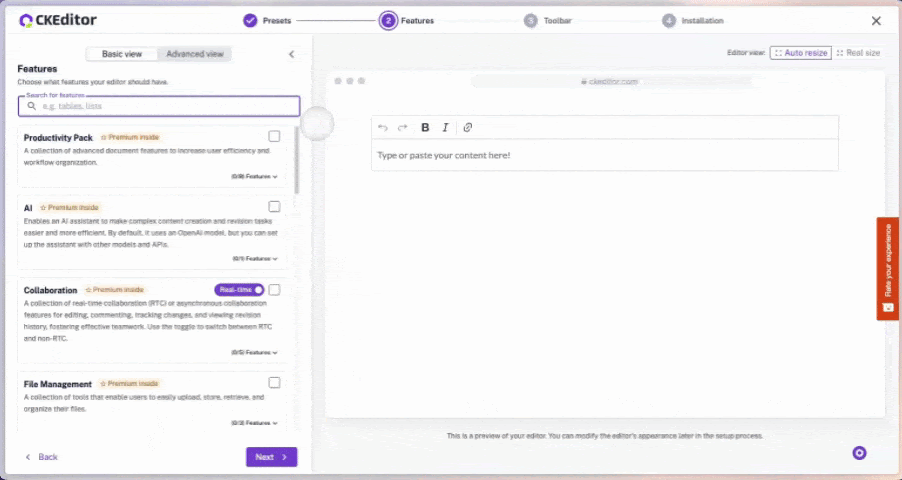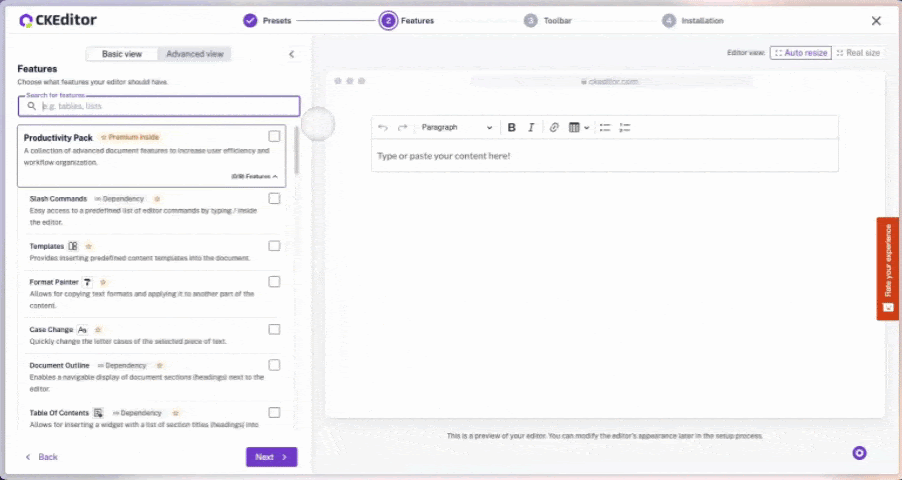 The Builder offers two views for feature selection — Basic for new users and Advanced for those familiar with CKEditor.