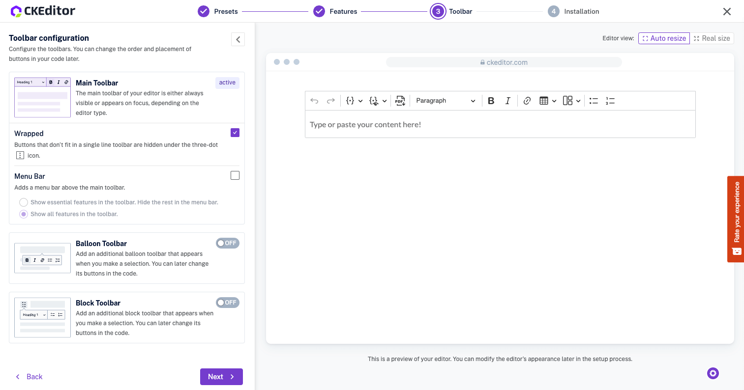 You can customize the toolbar’s behavior, such as collapsing buttons or adding a balloon toolbar for selected text. In this tutorial, we’ll keep the default toolbar configuration. Click Next to proceed.