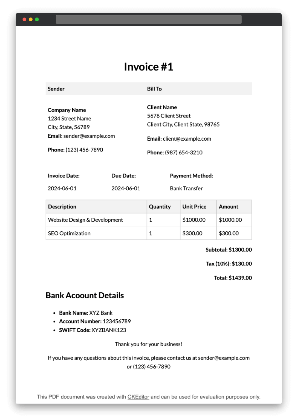 CKEditor integrates smoothly with various CKEditor 5 framework integrations like Angular, React, and Vue. In this guide, we’ll specifically explore how to build a custom invoice generator using CKEditor and React.