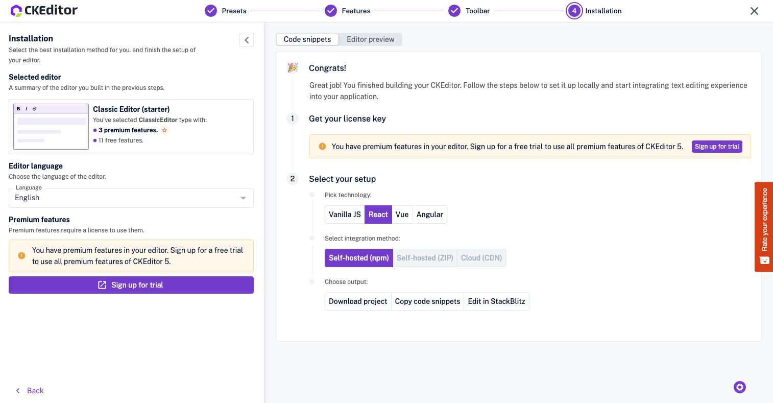 As the final step, after building your editor, we need to configure the project. Choose your desired technology, integration method, and output. In our case, we would go with the following: