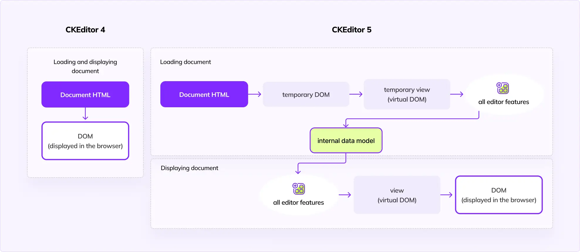 Compared to CKEditor 4, we no longer operate directly on the DOM. Instead, changes happen on the model layer and are propagated down to the DOM. This architecture enables the implementation of really demanding features and provides a way more predictable environment for feature developers.