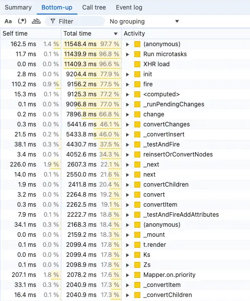 For this, we use the “Bottom-up” view, presented below. This view “sums up” all the calls for a given function. Here, you can learn which function took a bigger piece of the total initialization time.
