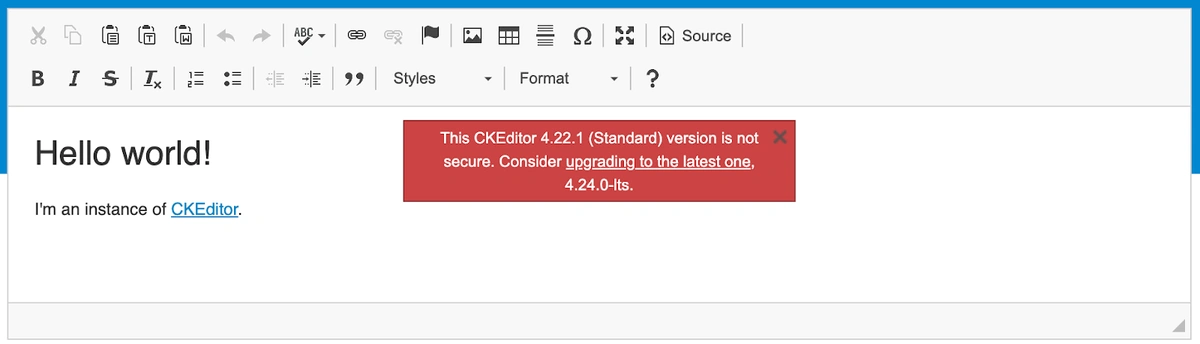 Starting July 1st, we’ll activate security notifications for CKEditor 4. This change will impact the open-source version 4.22 and all earlier versions served via our CDN. These notifications will alert users and integrators to the presence of unsecured CKEditor 4 versions, which may be vulnerable to security threats. As of this writing, the latest secure version of CKEditor 4 is 4.24.0-lts. Applications using secure CKEditor 4 versions won’t be impacted by these notifications.