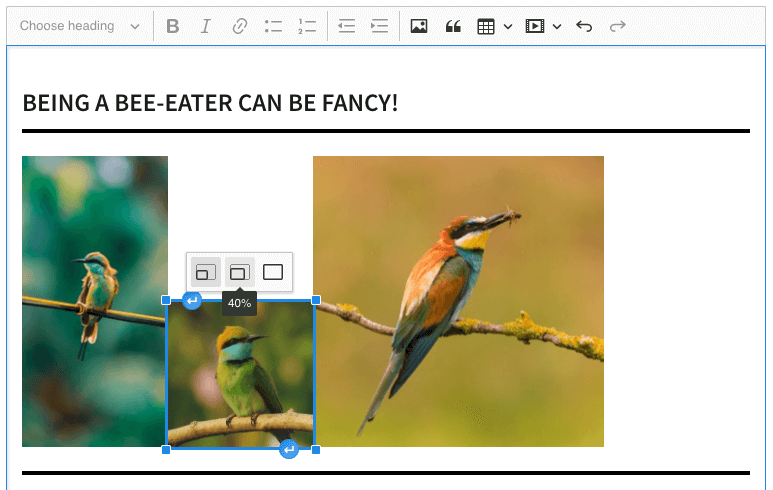 And don’t worry about ending up with a skewed image. When an image is added into CKEditor, its width and height attributes are retained to ensure the aspect ratio is respected when the image is resized.