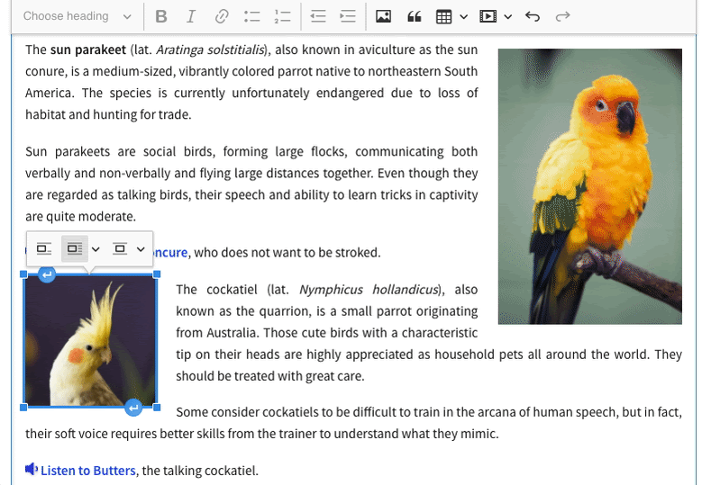 When you insert an image, CKEditor 5 will automatically decide, based on the image’s context and placement, whether it should be a block or an inline element. Don’t worry though— you don’t have to take CKEditor’s recommendation. You can use the image contextual toolbar to change whether the image is a block or inline element and change its alignment on the page. Since block images take up the full width, there’s no way to change their alignment.