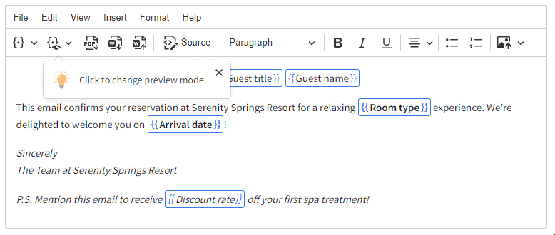 - Use CKEditor 5's preview mode to view how the document will appear with actual data. This mode allows you to verify that the merge fields are correctly configured and populated.