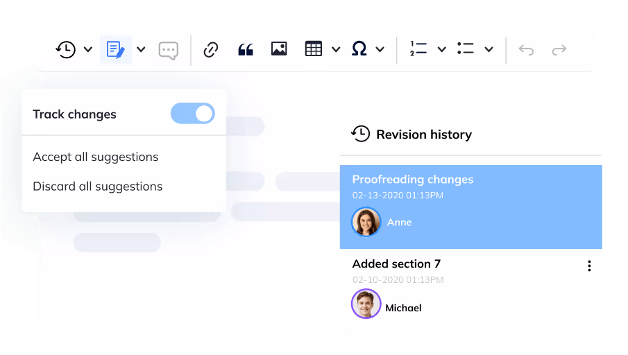 Streamline the content editing workflow and bring everyone together into one space, with Comments, Track Changes and Revision History.