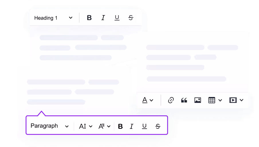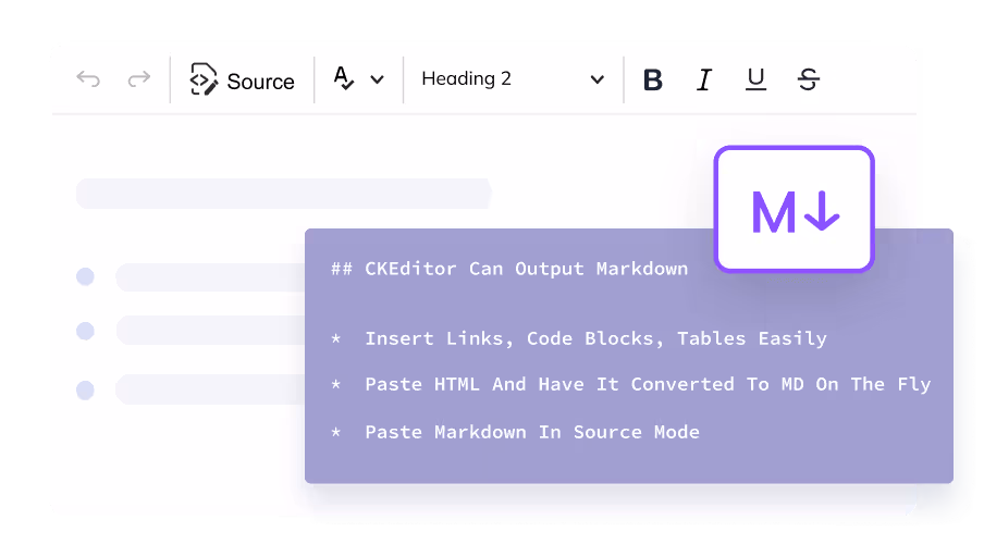 CKEditor can fit nicely with the rest of your application. Headless editor allows you to build your own UI on top of our editing engine, using your favorite technology.
