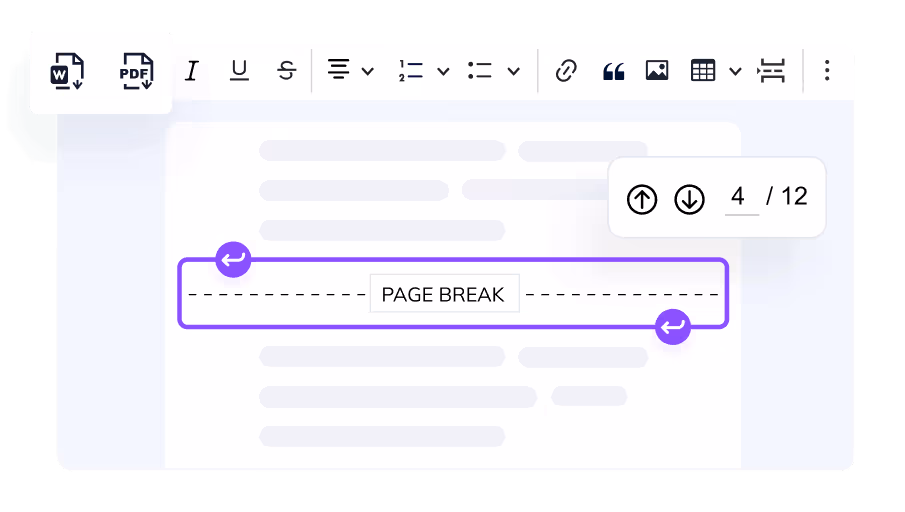 See how CKEditor automatically splits your content into pages. Convert your content to a PDF or Word file with a click of a button, keeping the original styles.