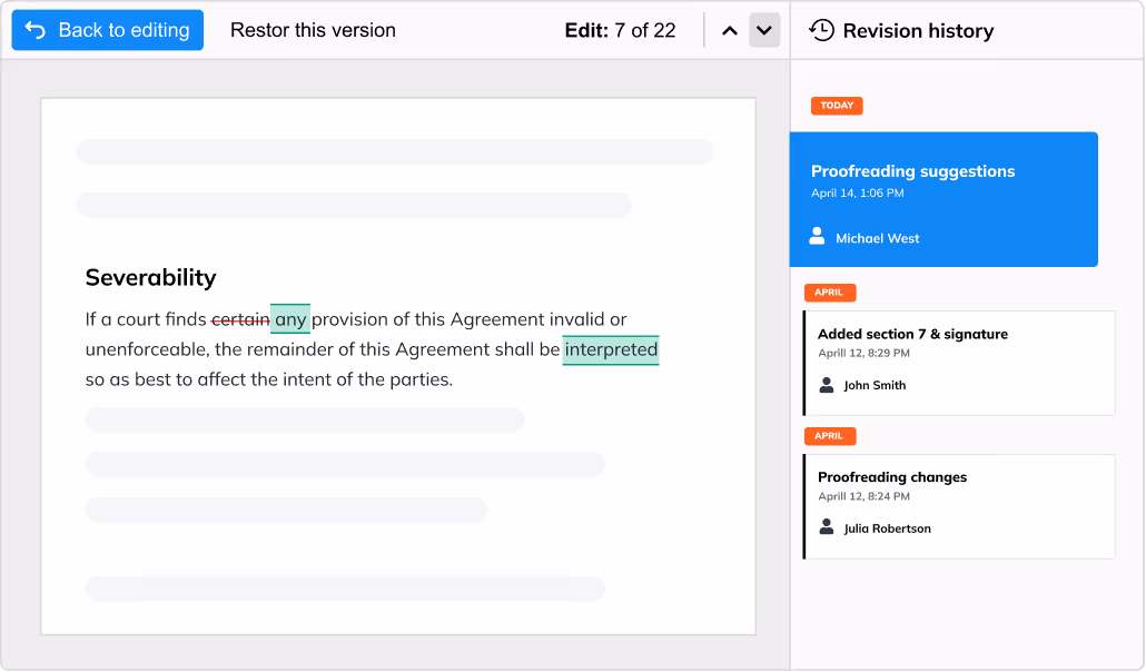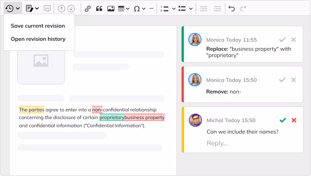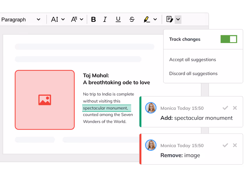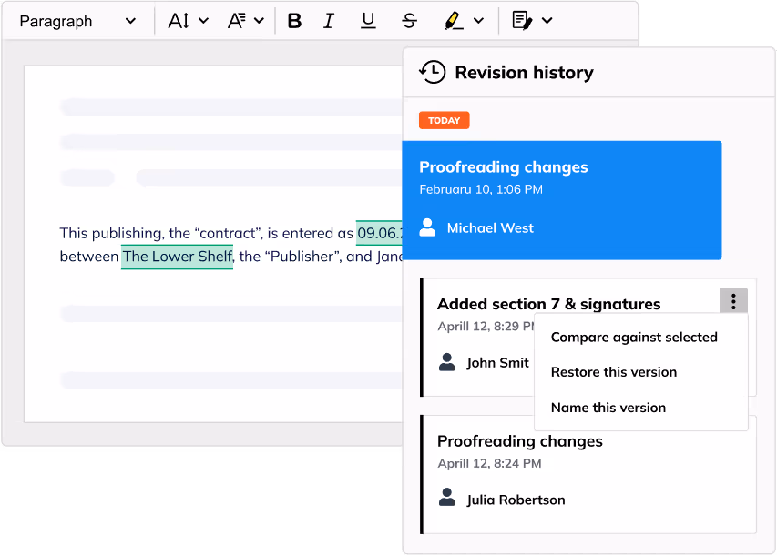 When Revision history is combined with CKEditor 5 Collaboration Features, your application achieves a Google Docs-like writing experience.