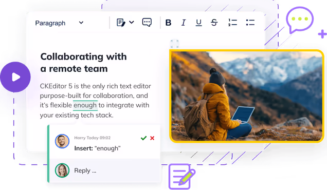 CKEditor 5 offers official integrations for frameworks like React, Vue, Angular, and many more. The Online Builder and UI presets make it easy to generate and configure custom builds that drop seamlessly into your product.